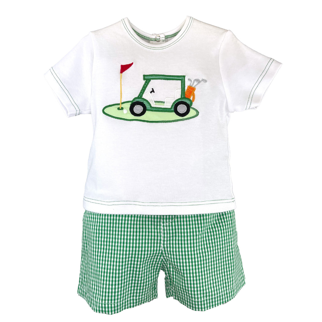 Two-piece set from Petit Ami features a white, short-sleeved shirt with golf cart applique on the front and snap closures at the back. The coordinating green and white checkered shorts feature elastic side inserts.