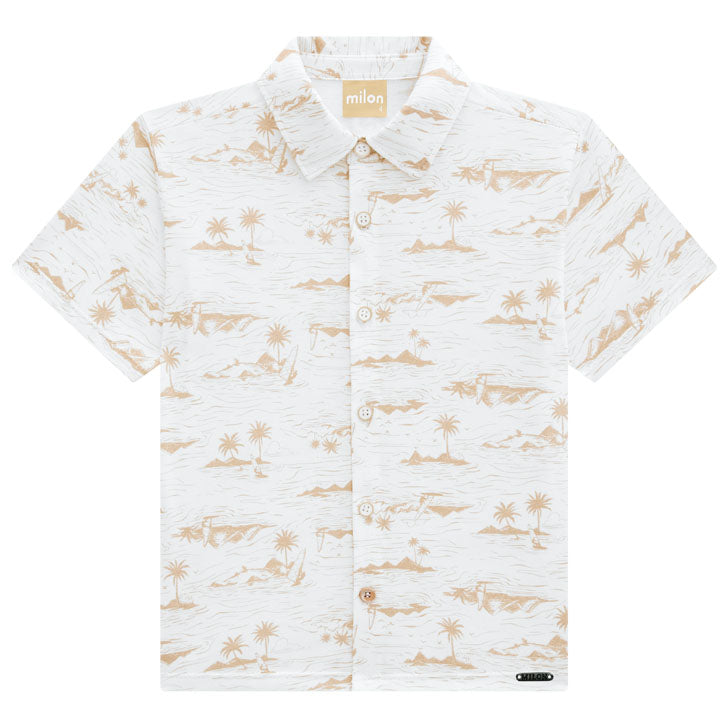 Short-sleeve palm tree and sailboat print knit shirt from Milon with a standup collar, a straight hem, and a button front.