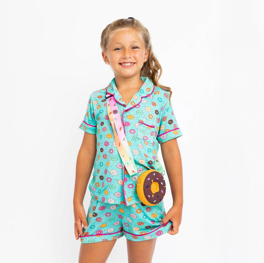 Short pajama set with donut print from Preppy Goose features a short-sleeve top with front button closures, V-neck, and front breast pocket. Elastic drawstring waist short bottoms with side pockets and a cuffed hem complete this set.
