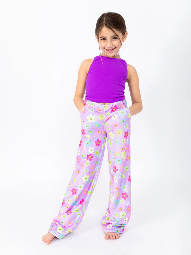 Soft, snuggly pajama pants from Preppy Goose feature an elastic waist, soft fleece inside, front pockets, and happy smiling daisy print.