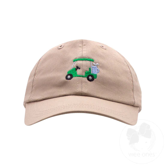 Tee off in style with this baseball cap from Wee Ones "wee stitch" collection featuring an embroidered golf cart and an elastic insert in the back. This playful cap is perfect for any young golfer or caddy. Keep the sun out of their eyes and show off their unique sense of style on the course. 100% Cotton.